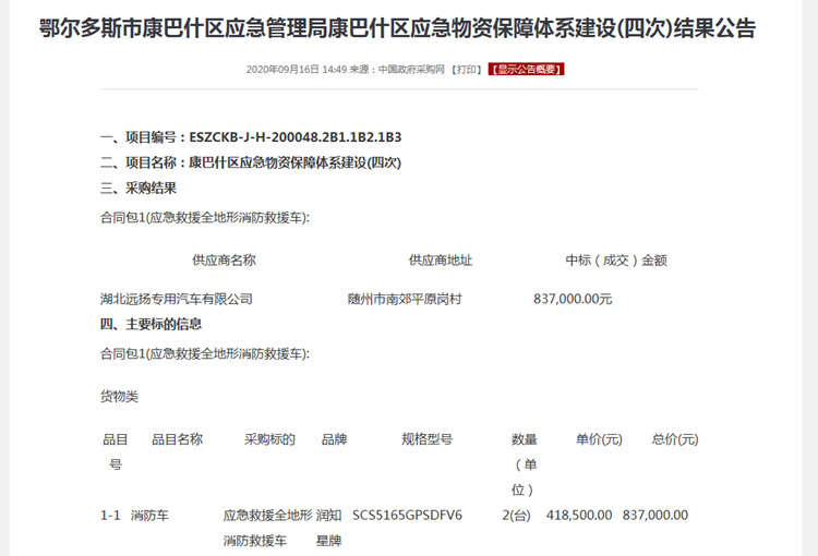 喜訊!康巴什區(qū)應(yīng)急物資保障體系建設(shè)—中標2臺越野消防車